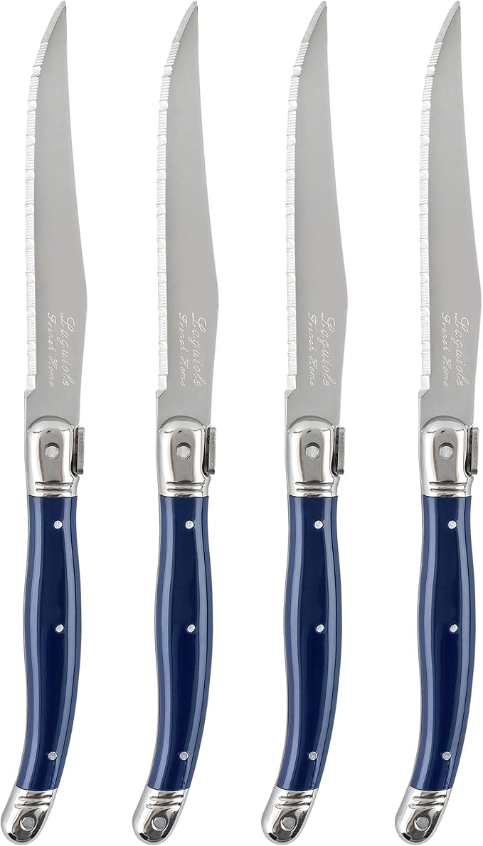 French Home Laguiole 4-Piece Steak Knife Set – Sophisticated Stainless Steel Dinner Knives with Navy Blue Handles & Iconic Bee Emblem – Serrated Knives for Smooth Cutting (9.25")