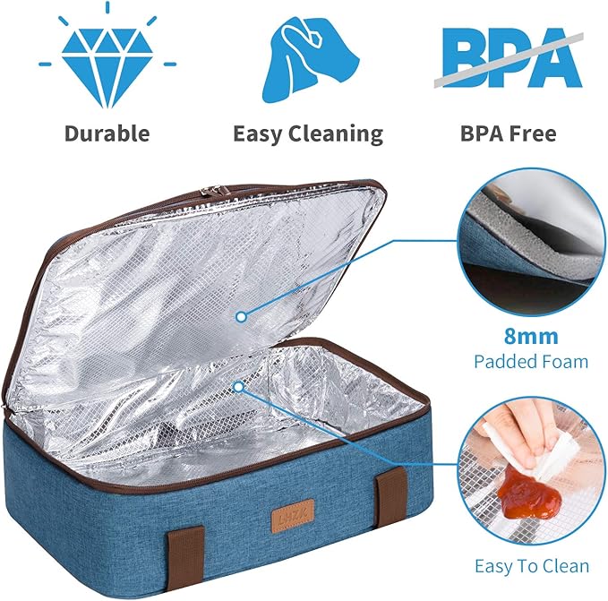 - 【Casserole Carrier for Hot or Cold Food】The inner lining is made of 8mm thick PE foam and food-grade aluminum foil, with double insulation and excellent heat resistance, which can keep food cold/hot/fresh for hours. The exterior of the casserole carrier is crafted out of water-resistant, dirt-proof 600D oxford fabric. The handles are sturdy and the inside is easy to clean.