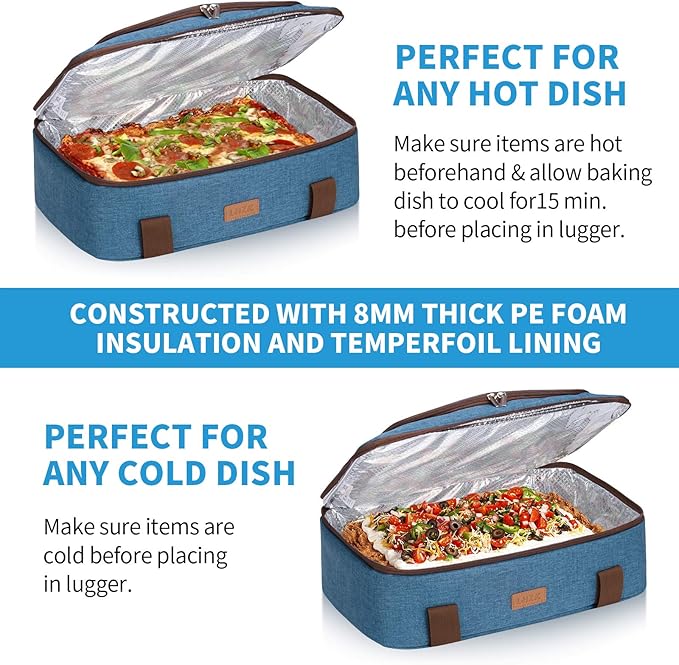 LHZK Double Decker Insulated Casserole Carrier for Hot or Cold Food, Expandable Hot Food Carrier, Lasagna Holder Tote for Potluck Parties, Picnic, Beach, Fits 11 x 15 or 9 x 13 Baking Dish (Blue)