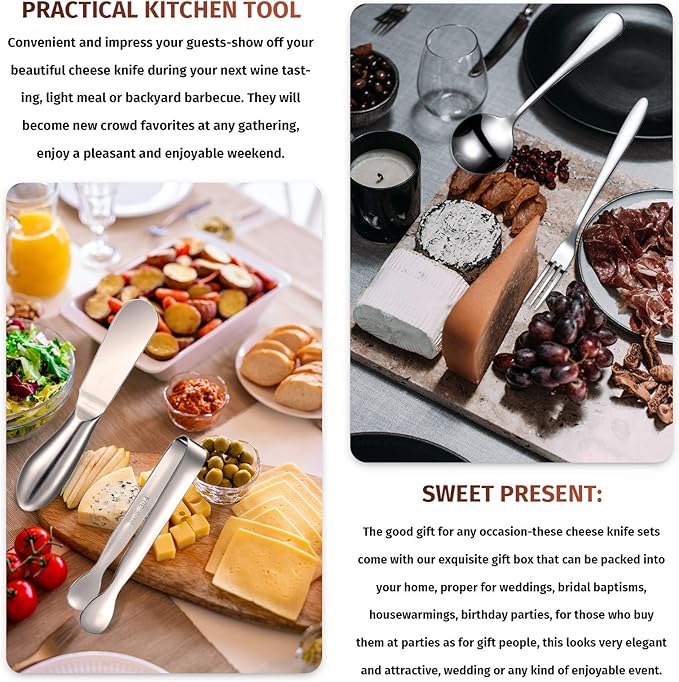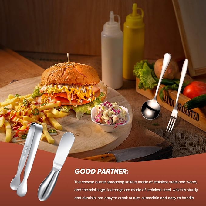 - 14 Pieces cheese butter spreader knives set: includes 4 pieces cheese butter spreader knives with stainless steel handles, 2 pieces mini serving tongs, 4 small spoons and 4 small forks for serving, applied in butter, cheese, butter, jelly, butter and pastry making; It is enough to satisfy your daily use and can be given to relatives and friends as gifts, which can bring a lot of convenience