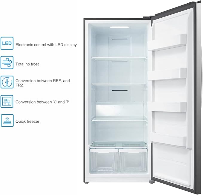 - [Convertible Upright Freezer/Refrigerator] This stand up freezer makes it easily and quickly to switch between refrigerator and freezer modes as needed. Temperature range: FRZ. -11° F - 10° F (-12° C - -24° C), REF. 35° F - 46° F (2° C - 8° C)