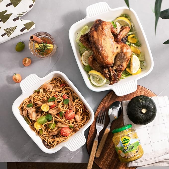 - Convenient Double Handle - Side handles with striped design help ensure a firm grip during transportation, and make taking the baking dish out of the oven a breeze. It's beautiful design let you take the baking dish from oven to table.