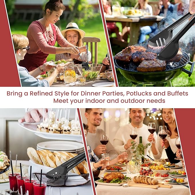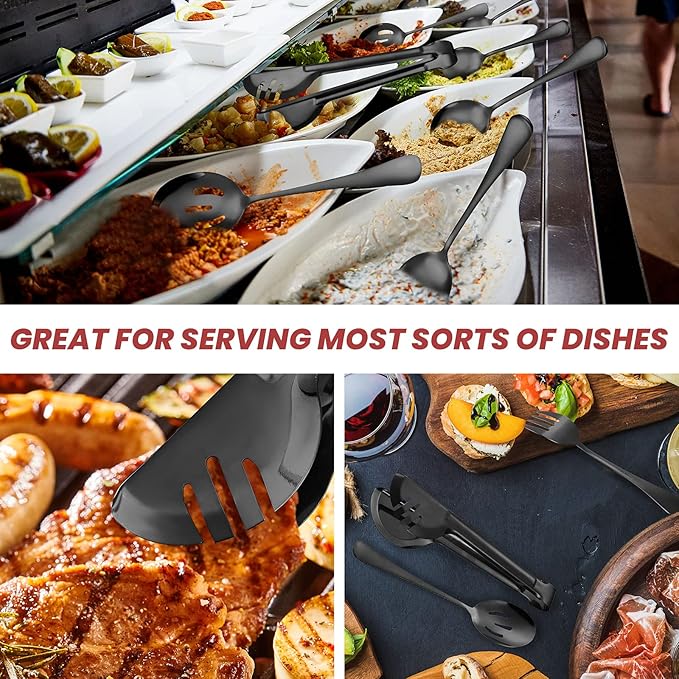 - Proper size: the tong measures approx. 9.4 inches in length, and both the serving spoon and the serving fork measure approx. 8.6 inches in length, suitable for all your parties, events and buffets, and they works well on catering, barbecue, wedding, celebration, banquet, holiday meal, Thanksgiving party supplies,Christmas party supplies,Halloween party supplies,potluck, home, restaurant, hotel, etc