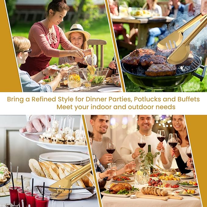 - Multiple uses: the practical tongs are applicable for flipping burgers or fish, grilling meat or as salad tongs, the slotted spoon and fork can let liquid pass through while preserving the solid food on the top, and the solid spoon without holes are optimal for stirring and serving food with a thick sauce