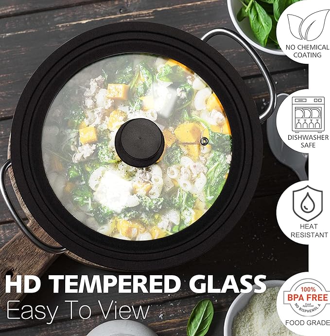 - PREMIUM SILICONE AND STRONG TEMPERED GLASS : The edge of the lid consist of food-grade silicone which is heat resistant to resist even under the high temperature cooking. The pot lid is made of tempered glass and silicone surrounded, strong, durable, reliable and not easy broken.