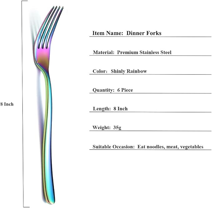 - 【Product Parameter】: Set of 6 Pieces rainbow 8" modern design sturdy high quality dinner forks.Perfect for special events, parties, birthday, wedding ect. Also perfect for daily use.