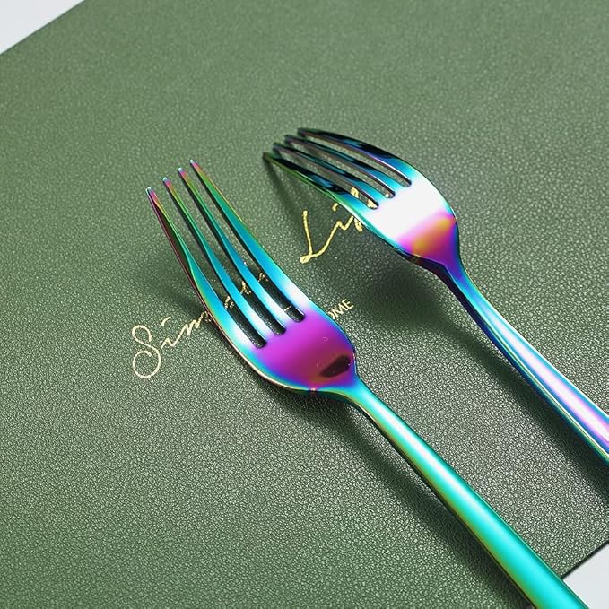 - 【Luxury and High Quality Finish】: These rainbow great dinner forks are polish with mirror finish and plating with titanium rainbow. Looks luxury and beautiful. The rainbow titanium plating would protect the surface of silverware from scrath. Food grade material healthy for daily use.