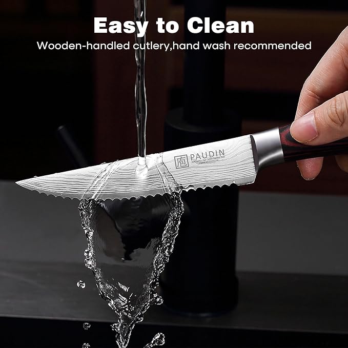 - [Sharp Serrated Blade Edge] The hand-sharpened 15 degree serrated blade ensures high cutting efficiency and prevents food from tearing or sticking to the steak knife after cutting. With a Rockwell hardness of 56+, the serrated knife cuts cleanly through thick or hard steaks or side dishes.