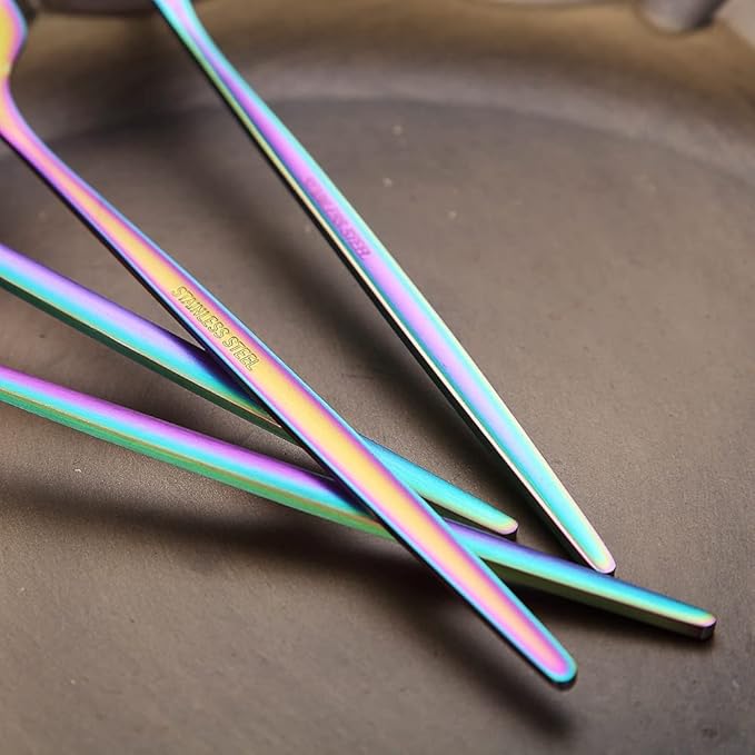 - 【Luxury and High Quality Finish】: These rainbow great dinner forks are polish with matt finish and plating with titanium rainbow. Looks luxury and beautiful. The rainbow titanium plating would protect the surface of silverware from scrath. Food grade material healthy for daily use.