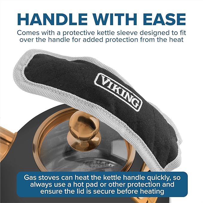 Viking 3-Ply Stainless Steel Tea Kettle, 2.6 Quart Stovetop Hot Water Pot with Tempered Glass Lid, Ergonomic Handle, Induction Ready, Matte Black and Copper