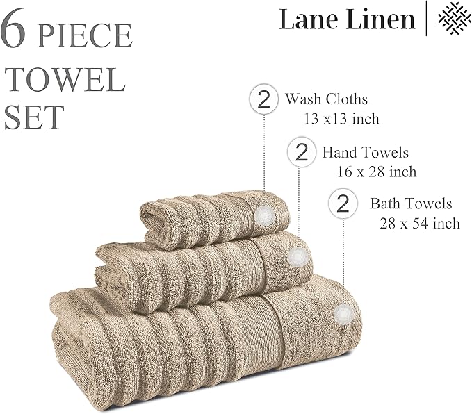 LANE LINEN Bath Towel Set - Soft and Absorbent, Ribbed, 100% Cotton Towels for Bathroom, Hotel, Body & Spa - 2 Bath Towels Large Size, 2 Bathroom Hand Towel and 2 Wash Cloths (6 Piece Set) - Taupe