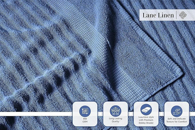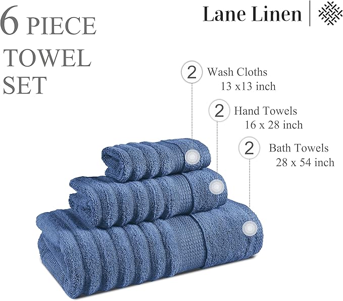 LANE LINEN Bathroom Towel Set - Premium Quality 100% Cotton Bath Towels Set of 6 Large Size - Quick Dry, Absorbent Hotel Towels for Bathroom Luxury - Includes 2 Bath, 2 Hand & 2 Wash Cloths - Denim