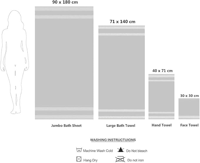 - INGREDIENT: Set contains 2 pieces of washcloths measuring 13 x 13 inches, 2 pieces of hand towels measuring 16 x 28 inches and 2 pieces of bath towels measuring 27 x 54 inches.