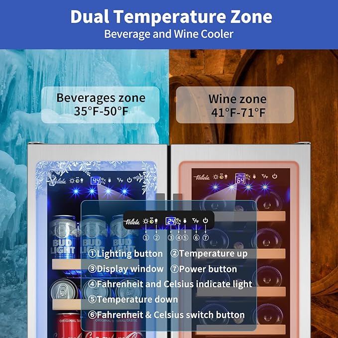 - 【Dual Zone for Wine and Beverage】The Velieta 24 Inch wine fridge has independently dual cooling zones. Wooden shelves for wine, wire shelves for beverages. Left Beverage zone -35℉-50℉ for all kinds of beverages.Right wine zone-41℉-64℉ for your treasured wine. Chill your drinks and wine at different temperatures.