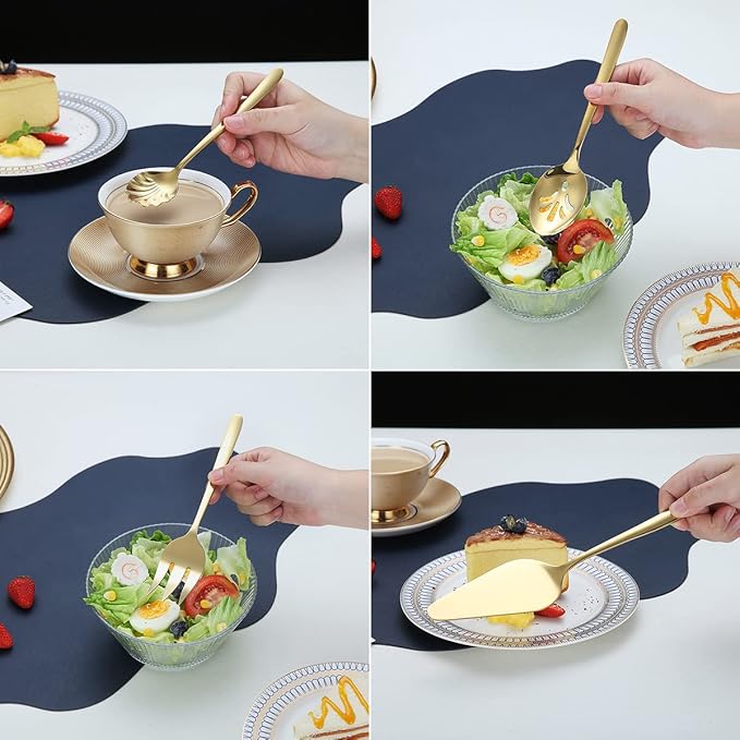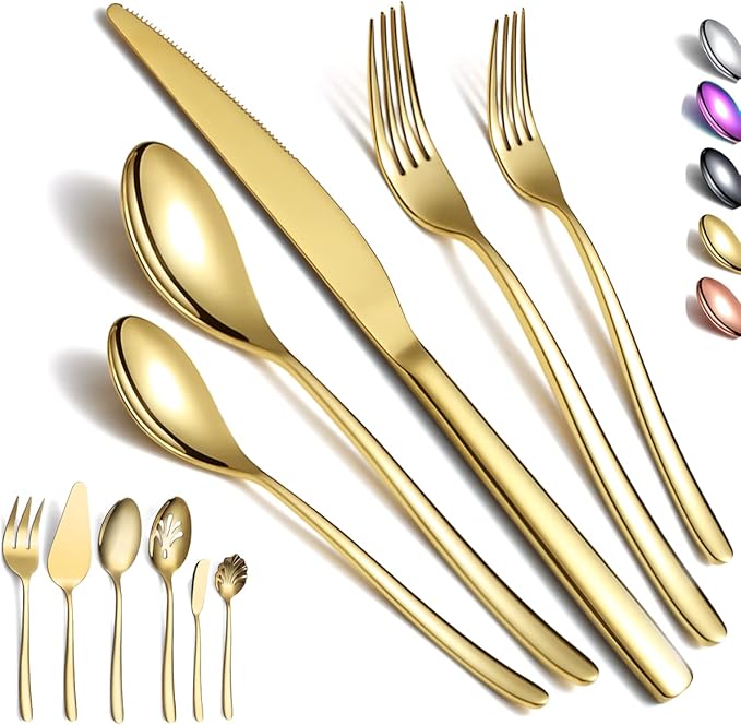 - Titanium Gold Noble Plating: The Gold color of the silverware set will stand out on your tabletop. They are beautiful and great that You will get a lot of "like", "praise", "laud" from your guests when you dinning together, from your funs when you share a video shot of your dinning. This is the just silverware that you worth to have.