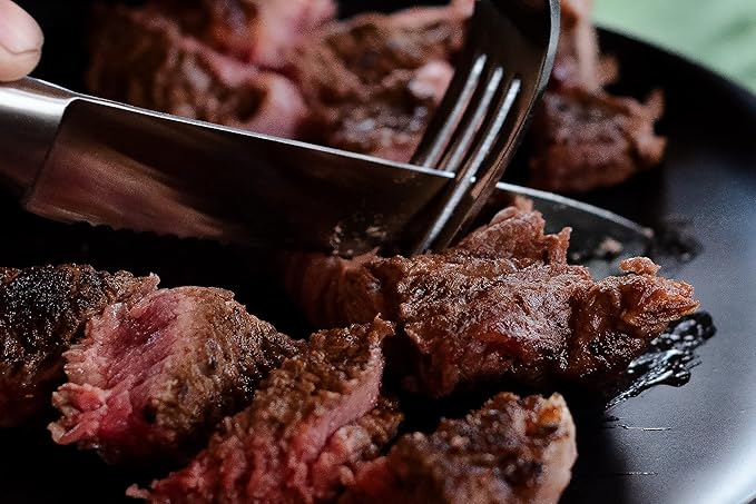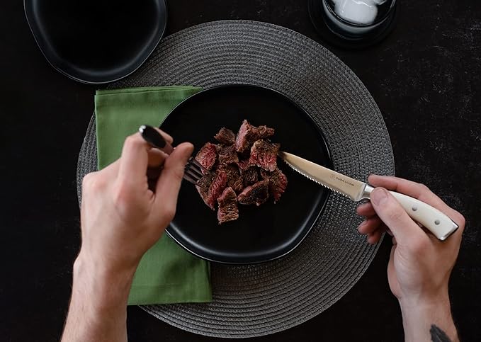 - Durable and Ultra-Sharp Blades: Crafted from high-carbon stainless steel, these serrated steak knives are designed to deliver long-lasting sharpness, effortlessly cutting through meat without tearing. Perfect for steaks, chicken, and more.
