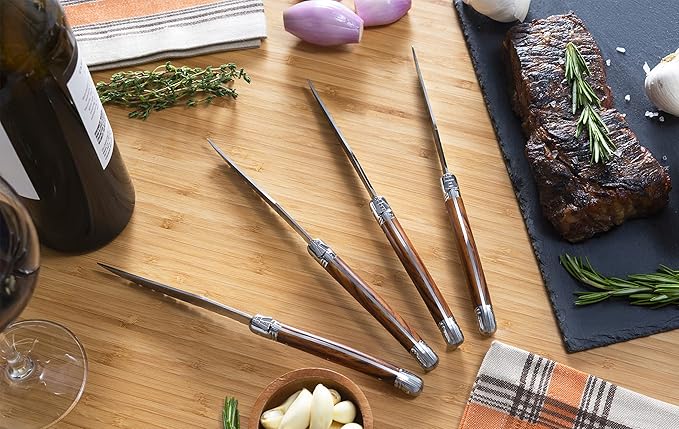 - Smooth Cutting, Even on Tough Meat: Effortlessly slice into a ribeye or filet with French Home’s Connoisseur Laguiole cutlery set for 4; the a 1.8mm thick stainless-steel serrated blades ensure precise and smooth carving of any cut of meat