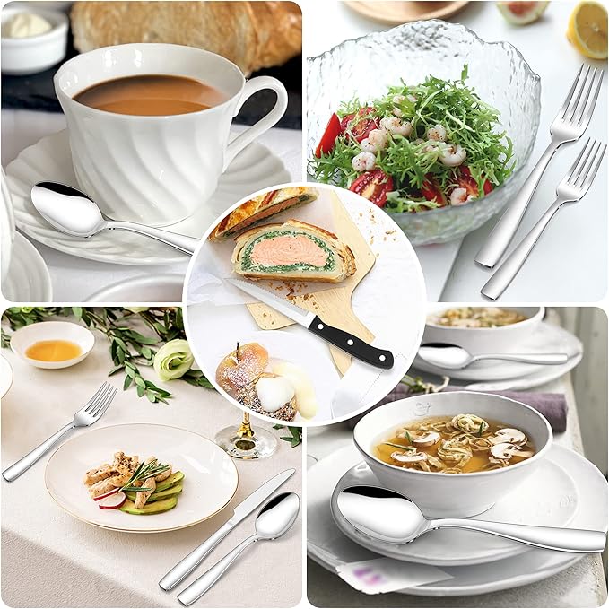- Exquisite workmanship, decent heft provide pleasurable feeling in your hands, sleek edges and smooth surface protect your lips and hands from hurting, concise but elegant appearance with highly lustrous mirror polish, this premium cutlery set will always keep gleaming even after numerous uses and dishwasher safe