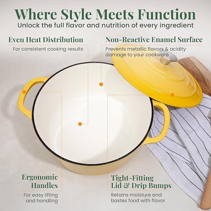 - Superior Heat Retention: Our enameled cast iron Dutch oven provides even heat distribution and retention, ensuring perfect roasts, stews, and baked bread every time.