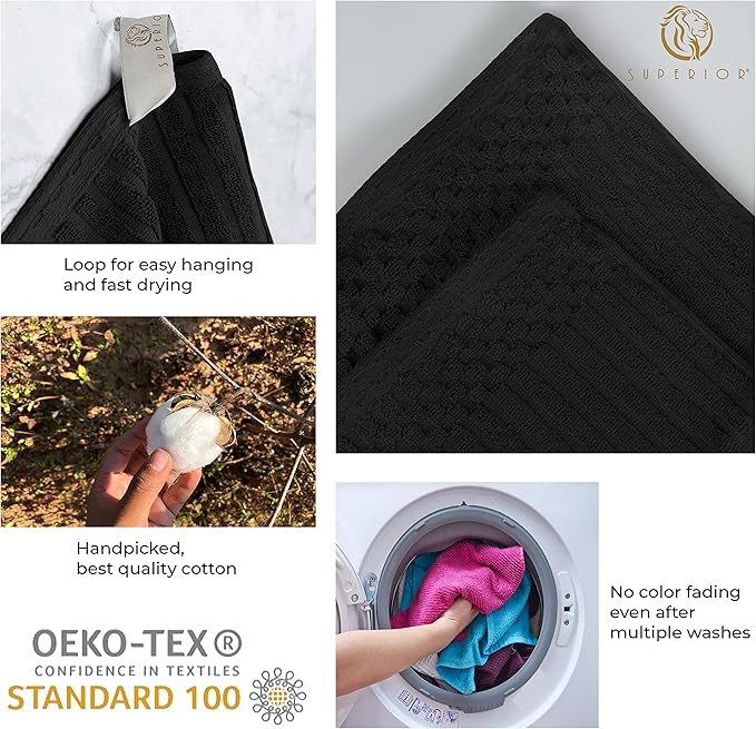 Cotton 4-Piece Solid and Ribbed Hand Towel Set, Hand Towels- 16" x 28", Black by Superior
