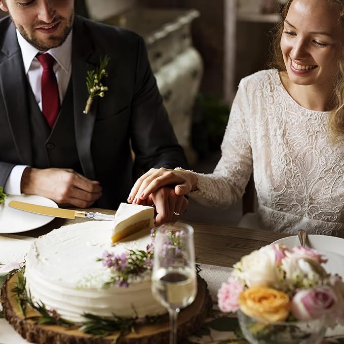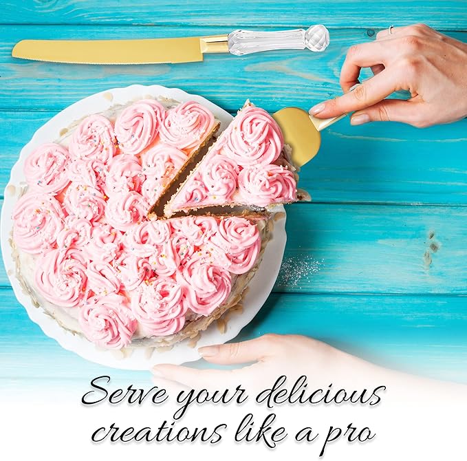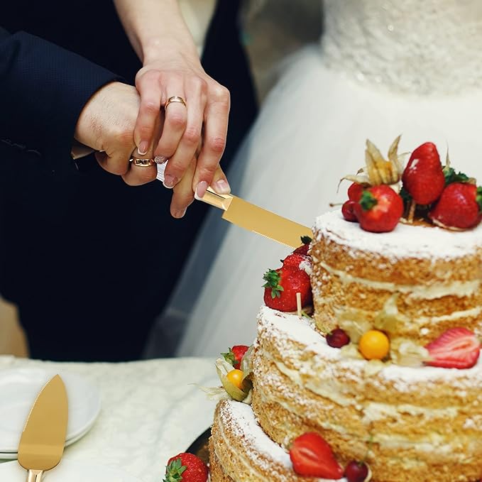 - 🍴 EXQUISITE CRAFTSMANSHIP: Our Gold Cake Knife and Server Set are expertly crafted from premium 420 stainless steel, providing the ultimate pair for a sophisticated cake. Each pack comes with an elegantly crafted stainless steel cake knife and stainless-steel cake server that are designed to add a memorable and sophisticated touch to the look of any cake-cutting ceremony.