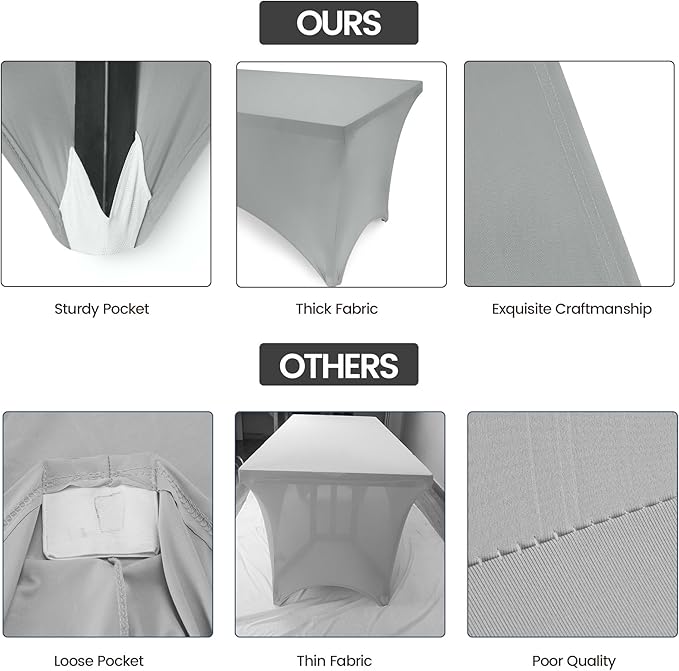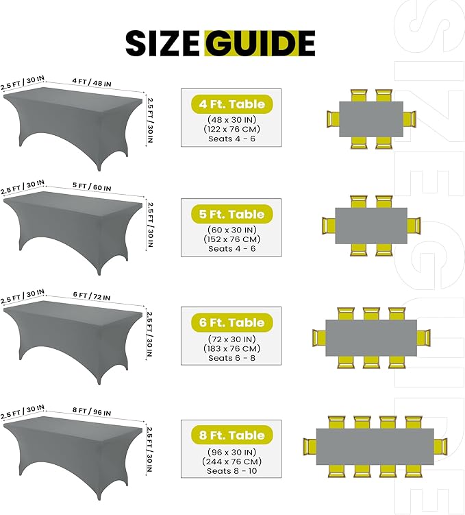 - Snug Fit with Reinforced Pockets: Designed for a 6-foot table (72"L x 30"W x 30"H), this 2-way stretch spandex cover features reinforced leg pockets to ensure a secure, professional look that won’t slip or ride up.