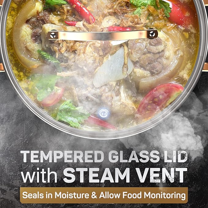- Comes With Tempered Glass Lid & Upgraded Package - Equipped with a steam vent lid, this elegant pot allows you to effortlessly monitor your cooking while sealing in heat, flavor, and nutrients. Plus, it comes in an upgraded, festive-ready packaging, making it perfect for any special occasion.
