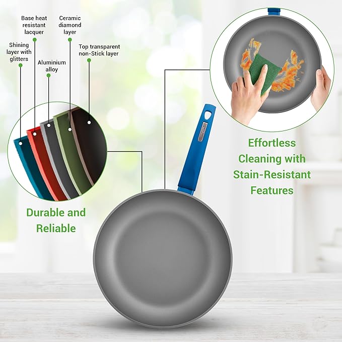 - NON-STICK COATING: The PTFE/PFOA/PFOS-free non stick pots and pans sets cooking ware features a long-lasting light gray nonstick coating inside for easy food release or tossing, cleaning & healthy cooking w/ blue heat resistant lacquer exterior
