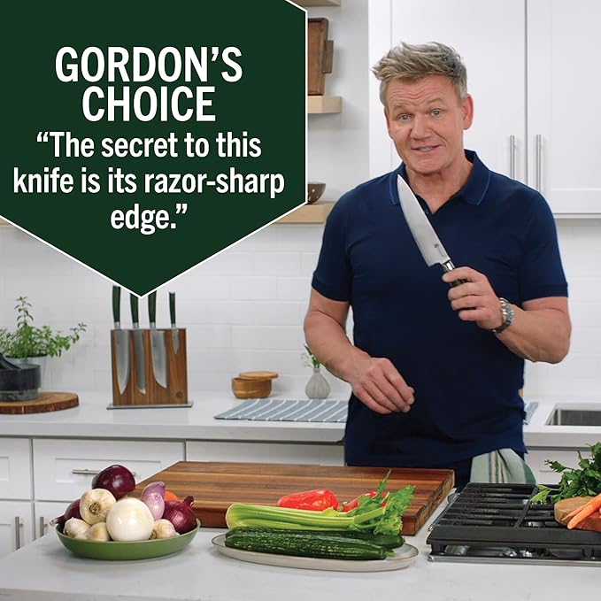 - Made utilizing the 3-step Honbazuke method – an advanced heat treatment to achieve a combination of hardness and flexibility that creates an exceptional 12-degree cutting edge.