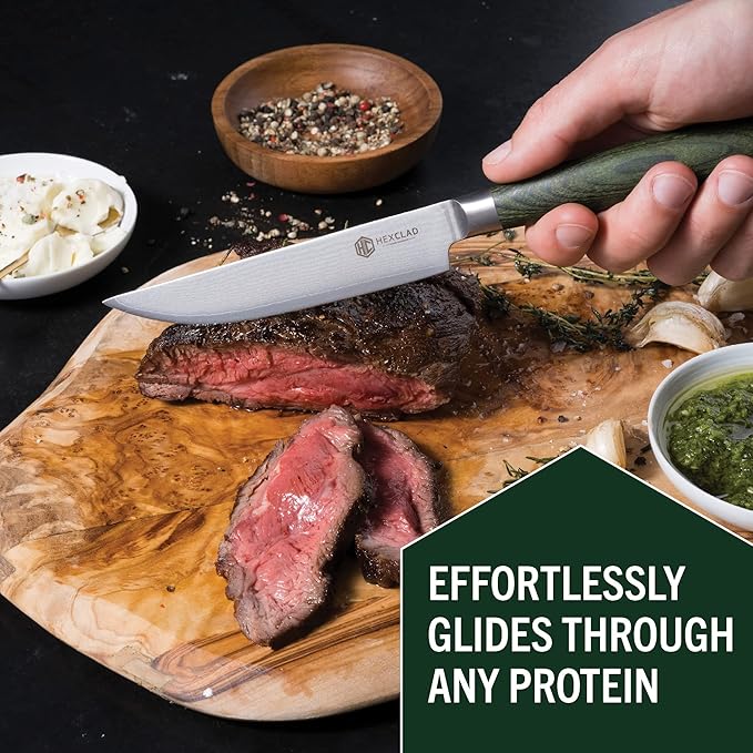 - Because of the Damascus steel construction, renowned among knife aficionados for its durability and sharpness, HexClad steak knives slice through even the densest meat like it's butter.