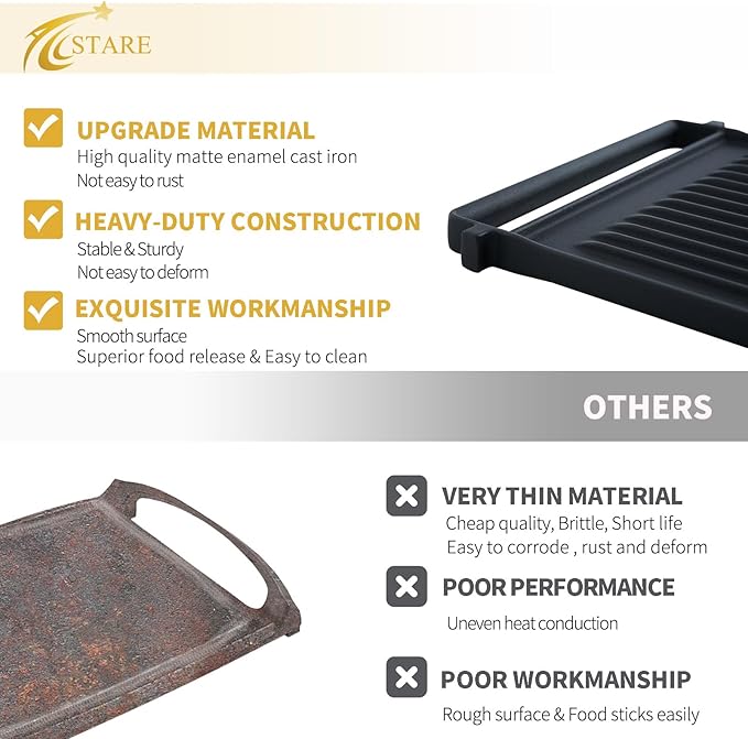 - 【UPGRADE HEAVIER AND MORE DURABLE GE GRIDDLE】 The double sided ge griddle made of matte enamel cast iron that heavier and more durable to ensure long-life lasting. The cast iron square griddle with unique flat surface that provides space for placing items, and well-designed about reversible cook surface that you can use two sides