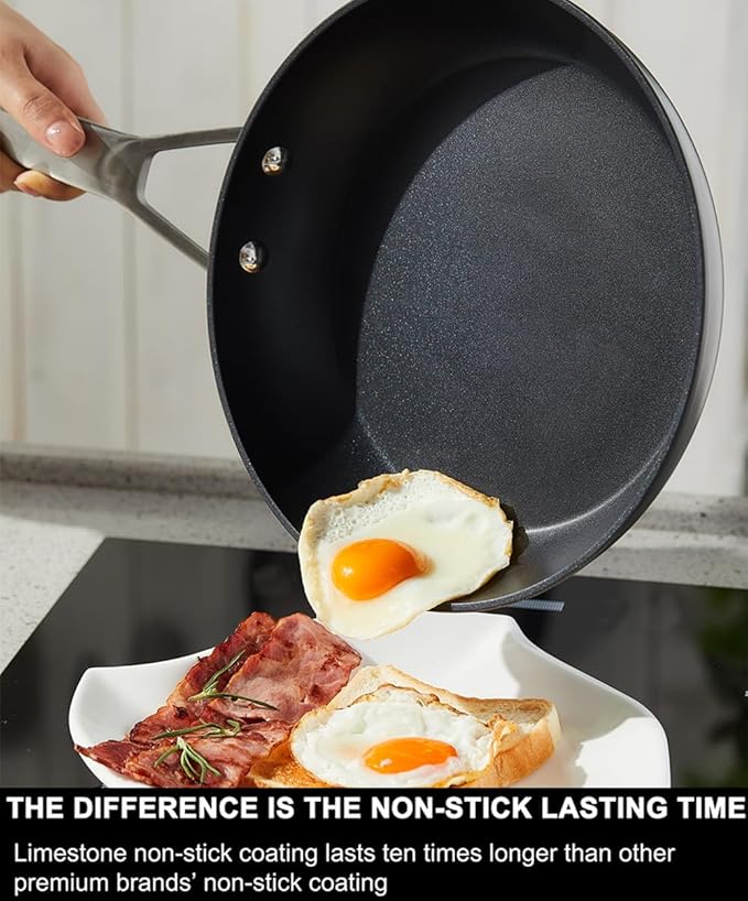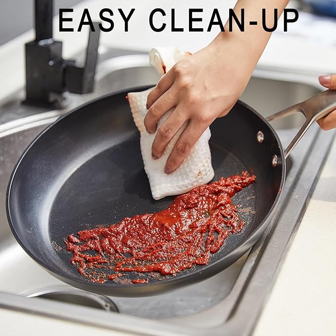 - [Nonstick and easy to clean] With German coating technology, MSMK cookware ensures effortless cleaning and maintains its non-stick properties even at temperatures up to 700℉. Its three-layer coating ensures the pan remains non-stick, scratch-resistant, and resistant to high temperatures.