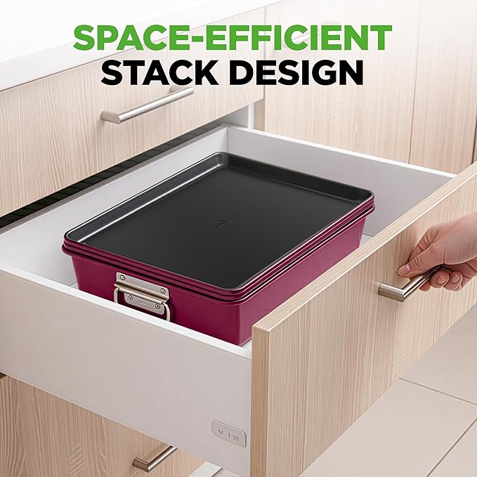 - STACKABLE DESIGN: The reusable professional non stick baking set molds feature a space-saving stackable wide tray pan design for convenient storage. It is fully compatible with kitchen ovens, countertop convection ovens, toaster ovens