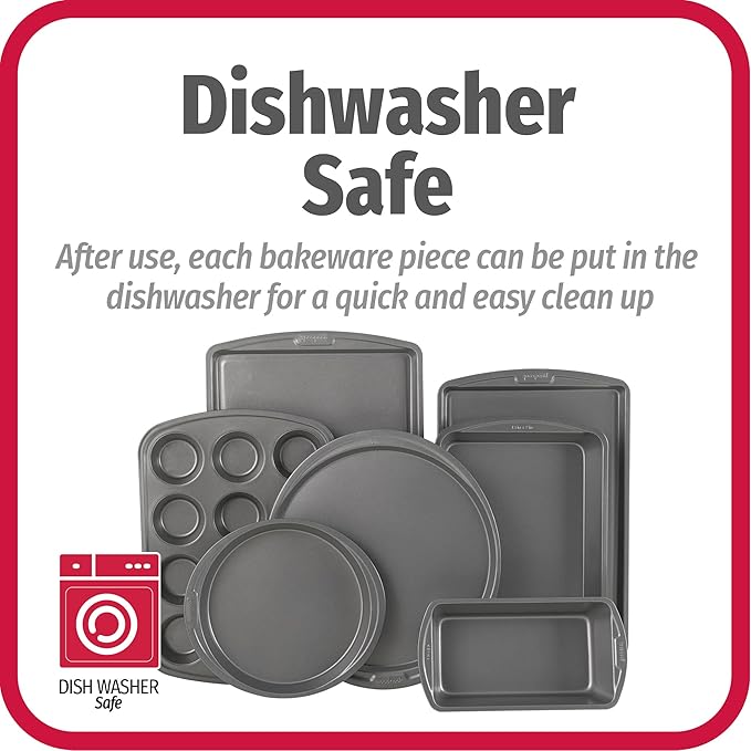 - DISHWASHER SAFE: This non-stick bakeware set is dishwasher safe for easy cleanup after use. Hand washing is recommended for longer-lasting use.