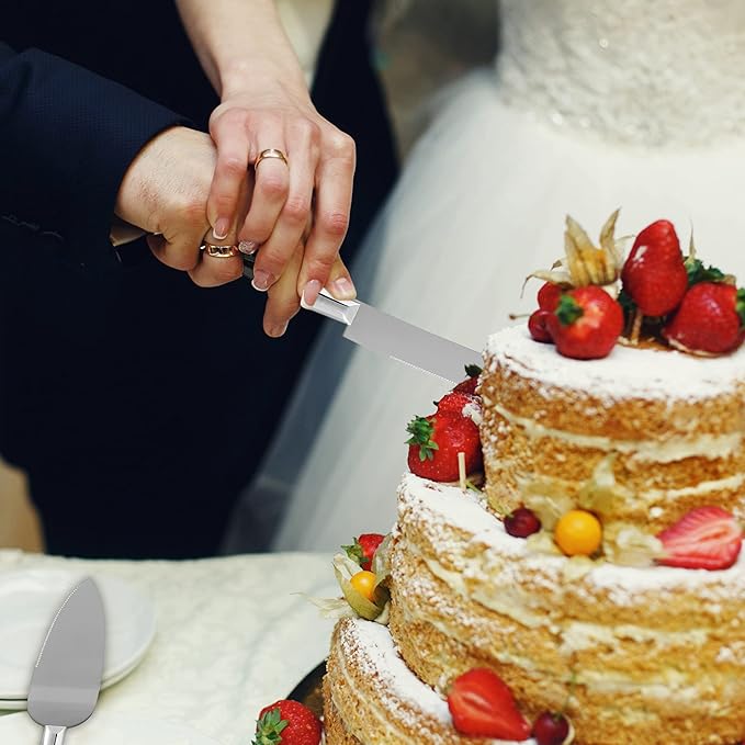 - EXQUISITE CRAFTSMANSHIP: Our Cake Knife and Server Set are expertly crafted from premium stainless steel, providing the ultimate pair for a sophisticated cake. Each pack comes with an elegantly crafted stainless steel cake knife and stainless-steel cake server that are designed to add a memorable and sophisticated touch to the look of any cake-cutting ceremony.