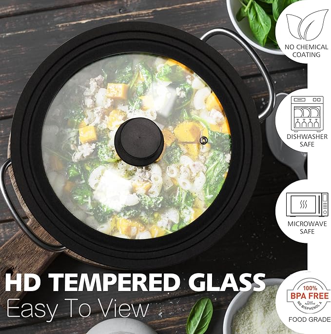 - PREMIUM SILICONE AND STRONG TEMPERED GLASS : The edge of the lid consist of food-grade silicone which is heat resistant to resist even under the high temperature cooking. The pot lid is made of tempered glass and silicone surrounded, strong, durable, reliable and not easy broken.