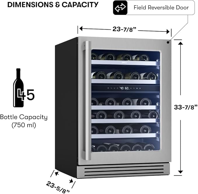 - Bottle Capacity: 45 bottles (750 ml) / Carbon Filter Air Filtration/ Door Open Alarm/ Dual-Pane, Low-e Argon-Filled Glass