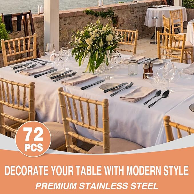 - 72 PCS SILVERWARE SET FOR 12 This black silverware set includes 12 dinner forks, 12 salad forks, 12 dinner knives, 12 dinner spoons, 12 steak knives and 12 teaspoons, Enough for daily use or restaurants. It is also an essential set for dinner parties or parties.