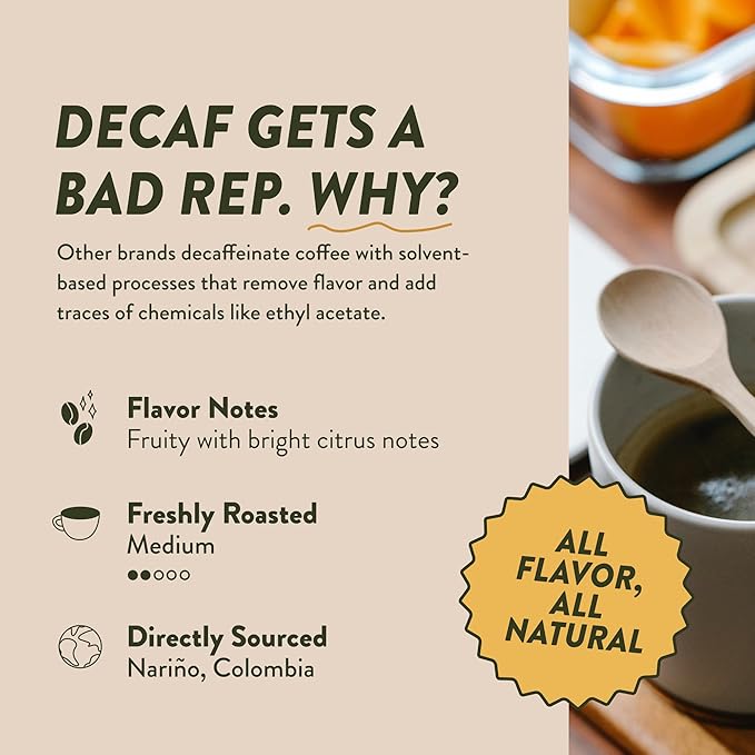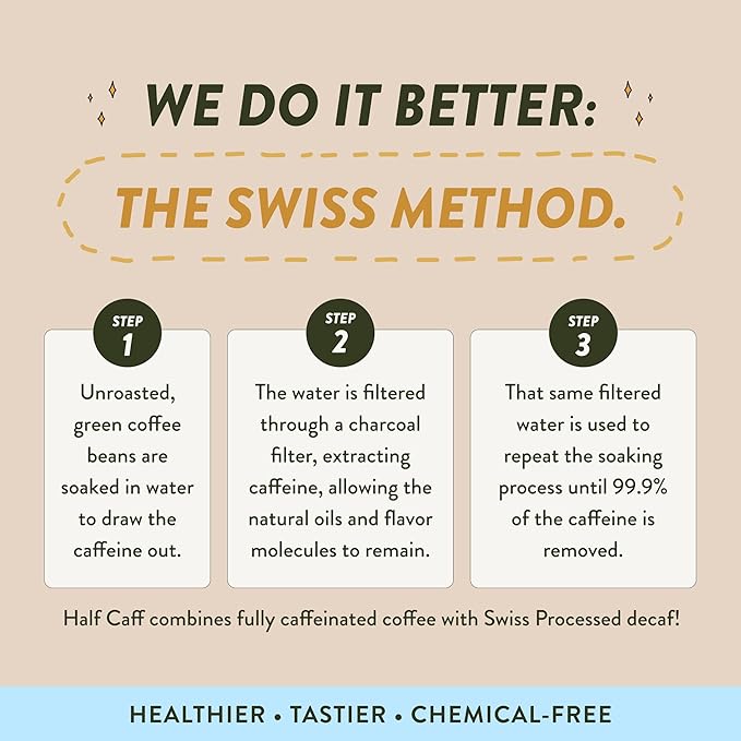- NATURALLY DECAFFEINATED: Using the natural decaffeination Swiss Water Process, we've been careful to preserve the bright and fruity flavors that make this coffee outstanding. Chemical-free!