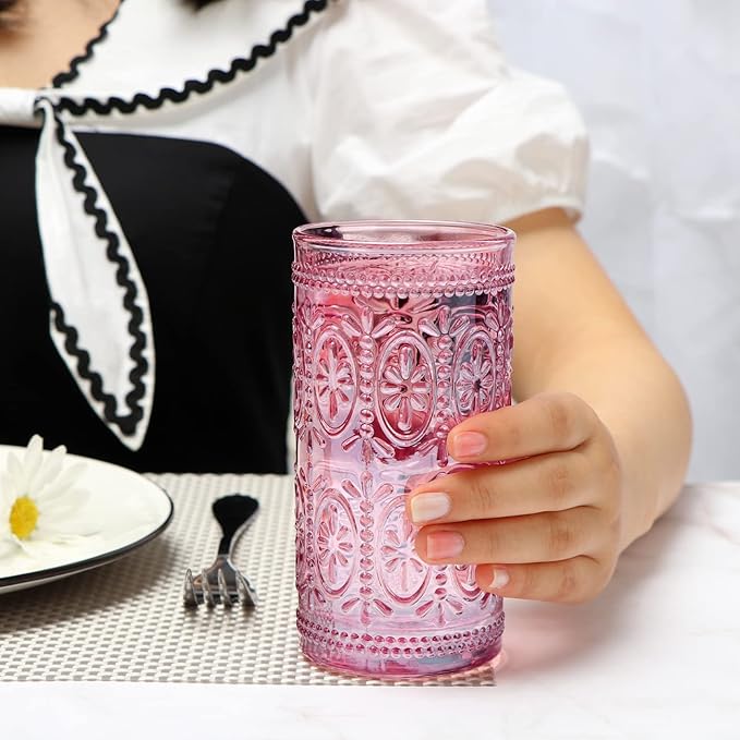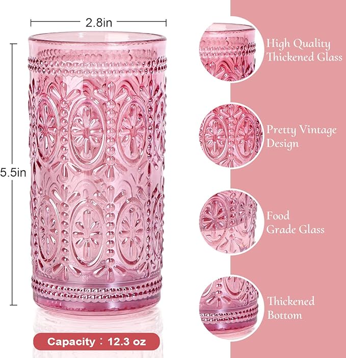 - What You Get: Set of 4 pink glasses drinking, measures 2.8"diameter, 5.5"High and 12 oz capacity and the perfect size.The pink glassware set with vintage embossed like rystal with an old-fashioned flair! Sturdy and oh-so-lovely! They add such color first thing in the morning and sparkle in the sunlight.