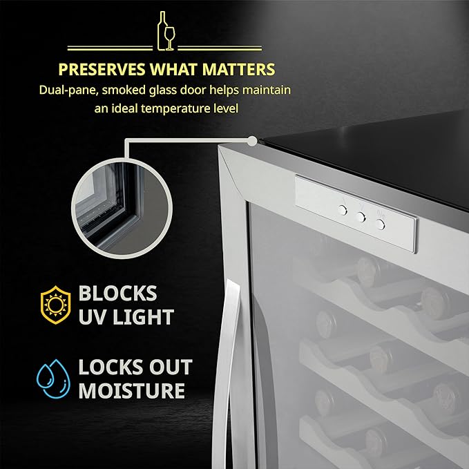 - UV-RESISTANT DOUBLE-PANED THERMOPANE GLASS - A double-paned glass door not only keeps the interior insulated, but also protects your collection from harmful UV light that can damage the tannins and overall flavor of your wine.