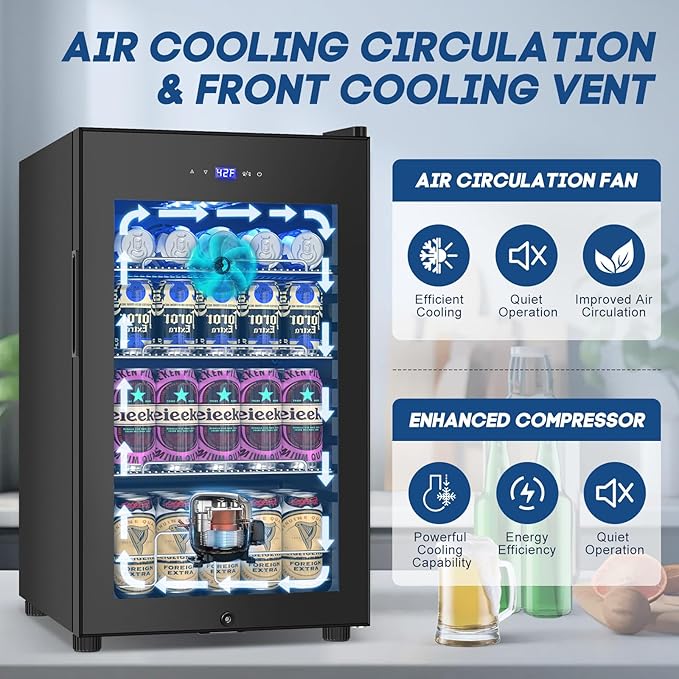 - 𝐀𝐝𝐯𝐚𝐧𝐜𝐞𝐝 𝐚𝐧𝐝 𝐏𝐨𝐰𝐞𝐫𝐟𝐮𝐥 𝐂𝐨𝐨𝐥𝐢𝐧𝐠 𝐒𝐲𝐬𝐭𝐞𝐦 - Our mini fridge with glass door features energy-efficient advanced technology, equipped with a powerful compressor, and an upgraded internal small convection fan to ensure that the air flows through the whole beverage fridge, keeping consistent air circulation for a uniform temperature supply inside. The temperature setting range is 3-18℃(37-65 ℉)