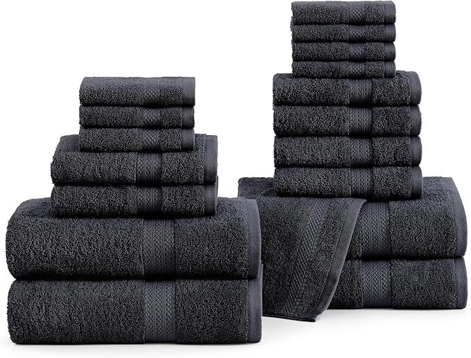 LANE LINEN 100% Ring Spun Cotton Black Bath Towel Set, 18PCs - 6 Hand, 8 Washcloths, 4 Shower Towels - Machine Washable & Sustainably Produced, Ultra Soft, Highly Absorbent & Pet Friendly