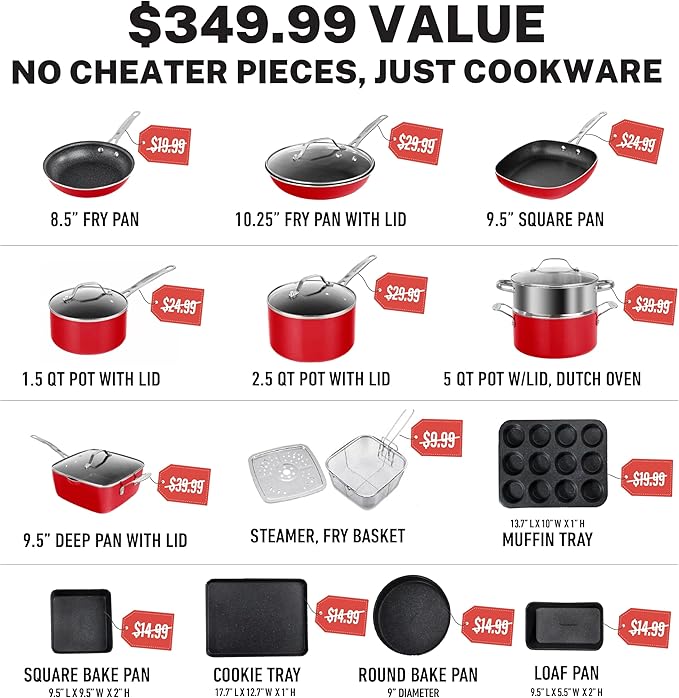 - Complete Kitchen In A Box: includes everything you need to completely outfit your kitchen and take cooking and baking to the next level, includes a full cookware set with frying pans, skillets, saucepans, stock pots with tempered glass lids, a deep frying and casserole pan with a steamer tray, fry basket and lid plus a complete PRO baking set with cookie sheet/jelly roll pan, loaf pan, muffin tin, square pan and more!