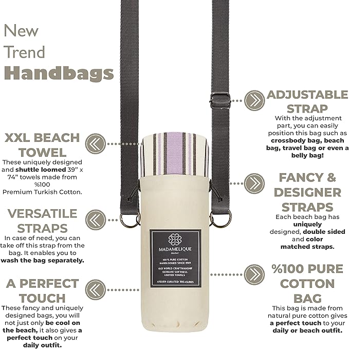 Madamelique Lavender Beach Towel with Beach Bag - 39 x 74 - Prewashed Cotton - Quick Dry - Sand Free - Hand Loomed Turkish Bath Towels