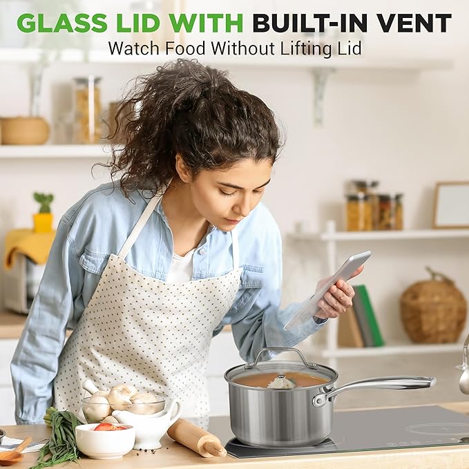 - SEE-THROUGH LID: This sauce pot for cooking is equipped w/ see-through tempered glass lid w/ vent hole that allows steam to escape. It effectively distributes & retains heat for even cooking w/ 500° F max temperature except glass lid