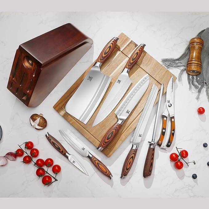 - 【Well-Designed Knife Set】Includes: 1*bone chopper, 1*chef knife, 1*bread knife, 1*santoku knife, 1*utility knife, 1*fruit knife, 1*kitchen shears, 1*Honing steel, 1*Knife Block. These blades will provide you with the perfect, clean separation you’ve been searching for bone chopping, slicing, precise peeling, filleting, skinning and trimming. It is essential for any serious chef.