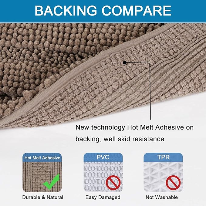 - ULTRA THICK: These bath rugs are passed GLOBAL RECYCLED STANDARD certificate. Compare the normal quality 1350g/sm, this plush chenille carpet set is more thick and bushy, quality up to 2000g/sm weight, thus make the bath mats amazing soft and cozy like a comfortable quilt protector for your feet