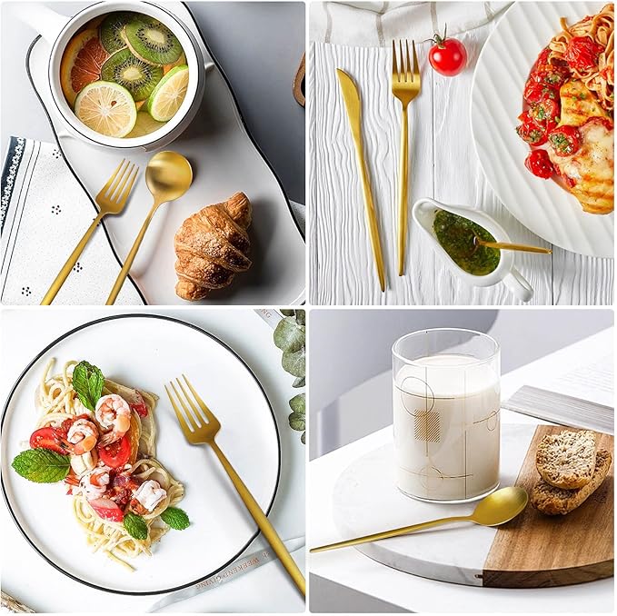 - Meticulous and Elegant Design: gold silverware is simple yet classic, modern and elegant, which can complement most of your dinnerware set; Timeless style meets contemporary design in the sophisticated gold utensils. The smooth edge of the handle is pleasure to hold, appropriate weight and perfect balance are added to ensure maximum comfort during use.