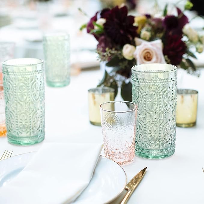 - What You Get: Set of 4 green glasses drinking, measures 2.8"diameter, 5.5"High and 12 oz capacity and the perfect size.The pink glassware set with vintage embossed like rystal with an old-fashioned flair! Sturdy and oh-so-lovely! They add such color first thing in the morning and sparkle in the sunlight.